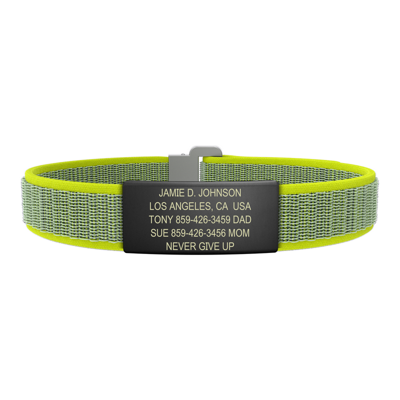 The top-shelf choice in wrist ID. Customize till your heart’s content with a smorgasbord of faceplates, band types, sizes, and colors for an ID that’s uniquely you. Perfect for everyday wear and up for any adventure. Up to 5 or 6 lines of custom text.