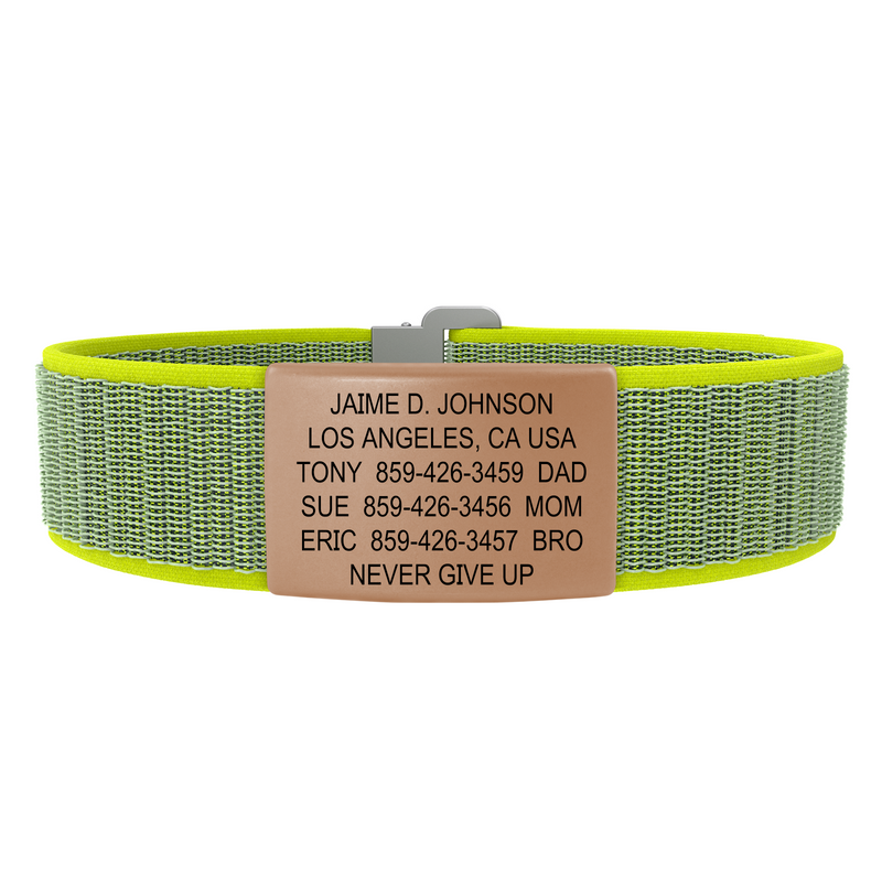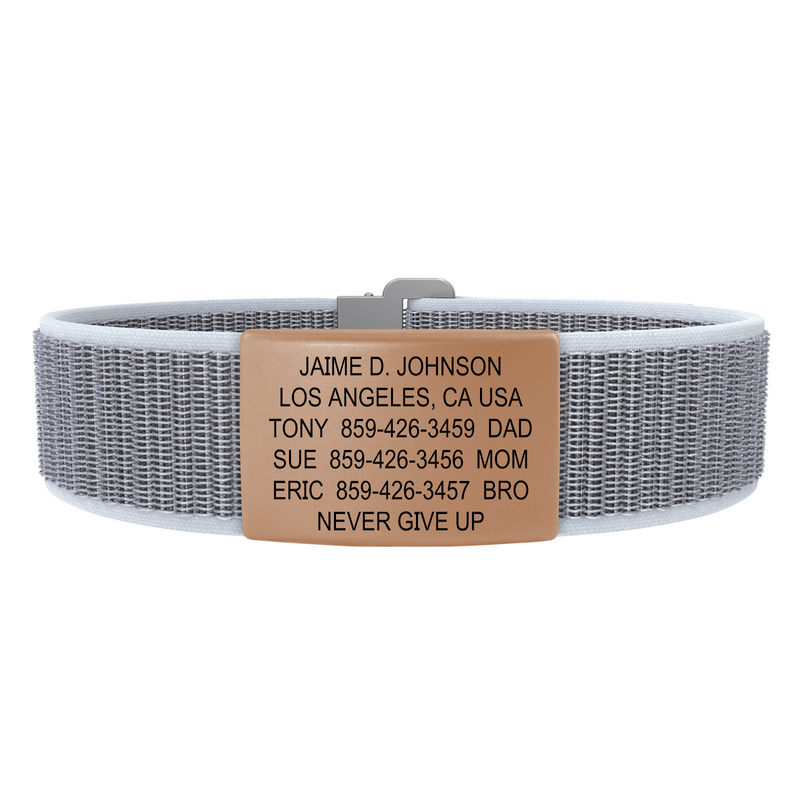 The top-shelf choice in wrist ID. Customize till your heart’s content with a smorgasbord of faceplates, band types, sizes, and colors for an ID that’s uniquely you. Perfect for everyday wear and up for any adventure. Up to 5 or 6 lines of custom text.