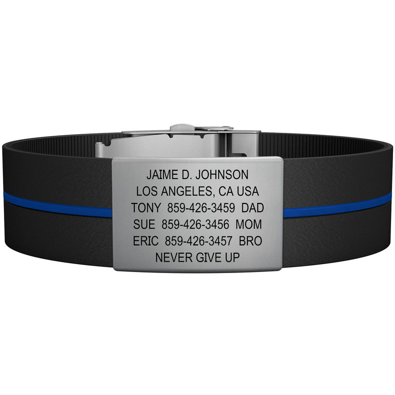 The top-shelf choice in wrist ID. Customize till your heart’s content with a smorgasbord of faceplates, band types, sizes, and colors for an ID that’s uniquely you. Perfect for everyday wear and up for any adventure. Up to 5 or 6 lines of custom text.