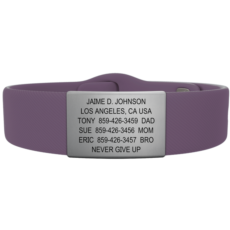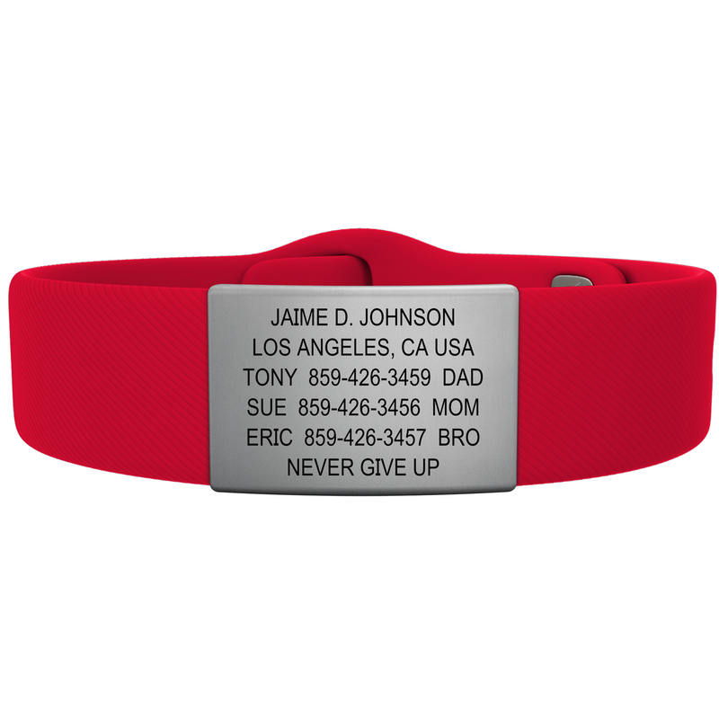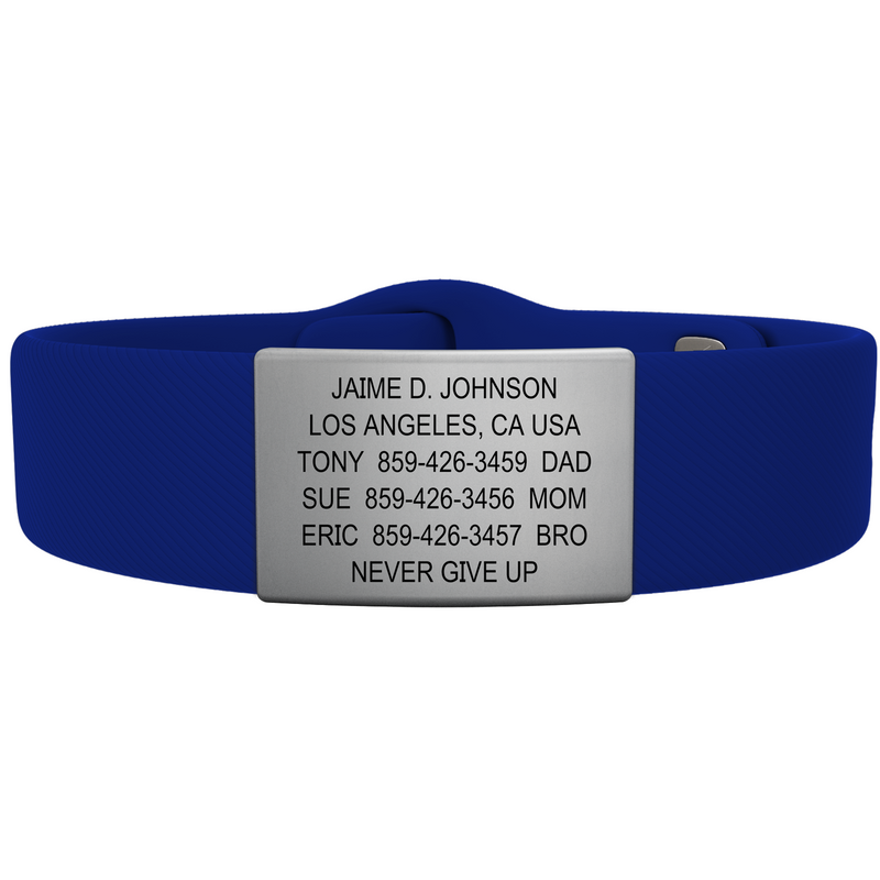 The top-shelf choice in wrist ID. Customize till your heart’s content with a smorgasbord of faceplates, band types, sizes, and colors for an ID that’s uniquely you. Perfect for everyday wear and up for any adventure. Up to 5 or 6 lines of custom text.