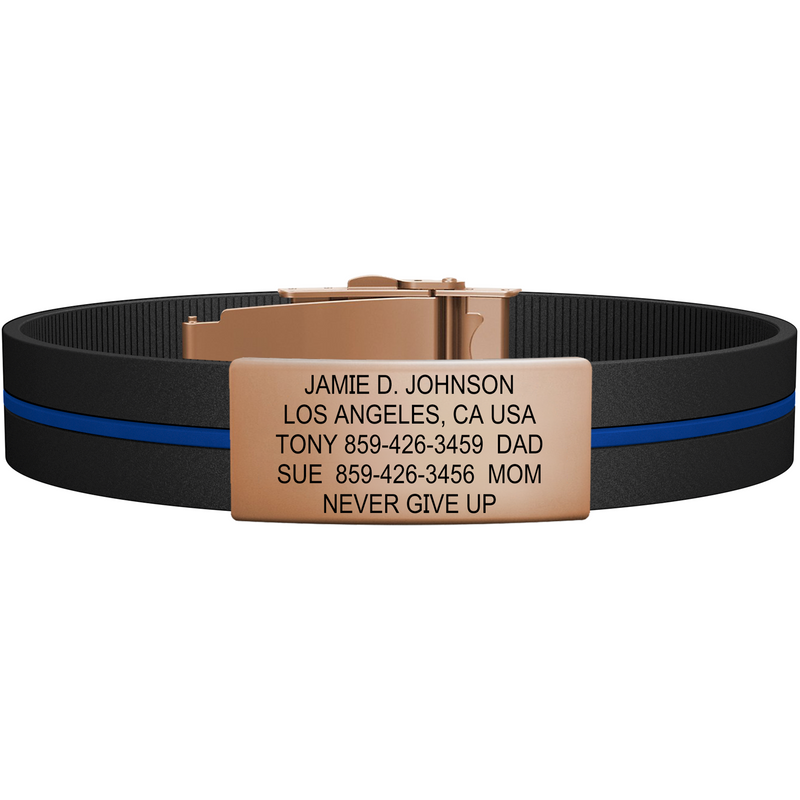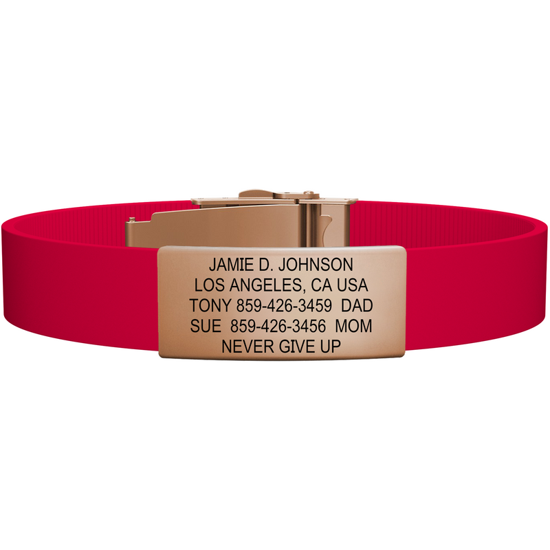 The top-shelf choice in wrist ID. Customize till your heart’s content with a smorgasbord of faceplates, band types, sizes, and colors for an ID that’s uniquely you. Perfect for everyday wear and up for any adventure. Up to 5 or 6 lines of custom text.