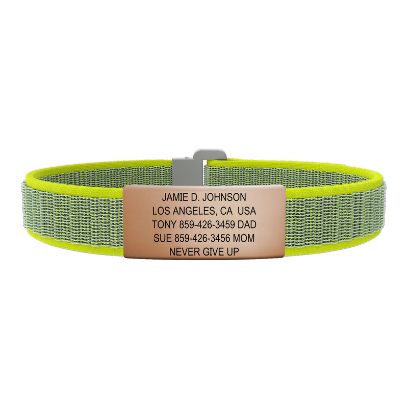 The top-shelf choice in wrist ID. Customize till your heart’s content with a smorgasbord of faceplates, band types, sizes, and colors for an ID that’s uniquely you. Perfect for everyday wear and up for any adventure. Up to 5 or 6 lines of custom text.