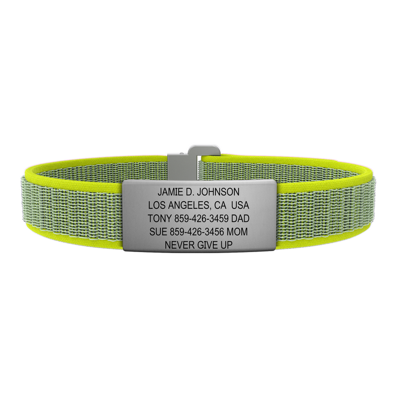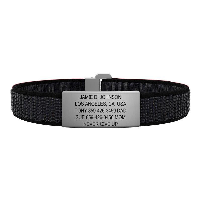 The top-shelf choice in wrist ID. Customize till your heart’s content with a smorgasbord of faceplates, band types, sizes, and colors for an ID that’s uniquely you. Perfect for everyday wear and up for any adventure. Up to 5 or 6 lines of custom text.